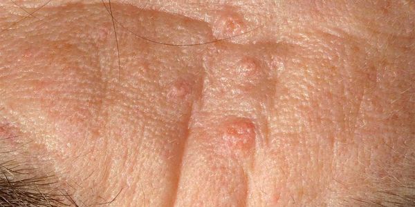 Sebaceous hyperplasia is the term used for enlarged sebaceous glands seen on the forehead or cheeks. It is a harmless, common skin condition that becomes more common with age. It happens when your sebaceous oil glands make too much oil that gets trapped under your skin and causes bumps. Sebaceous hyperplasia appears as small yellow bumps up to 3 mm in diameter.