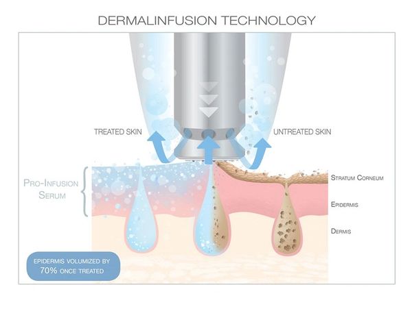 Dermalinfusion is a patented, non-invasive, 3-in-1 hydrodermabrasion treatment that simultaneously exfoliates, extracts and infuses skin with condition-specific serums for an all-inclusive treatment in one step. The dermalinfusion handpiece tip creates a closed-loop suction on the skin upon contact, instantly lifting it for extractions and abrasion by the exfoliating diamond tip. At the same time, pressure infuses the skin with ingredient-rich serums.